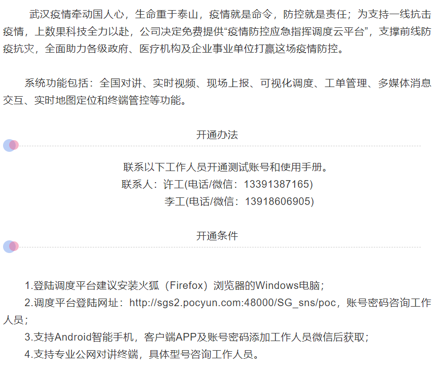 武汉疫情牵动国人心,生命重于泰山,疫情就是命令,防控就是责任;为支持一线抗击疫情,上数果科技全力以赴,公司决定免费提供“疫情防控应急指挥调度云平台”,支撑前线防疫抗灾,全面助力各级政府、医疗机构及企业事业单位打赢这场疫情防控。
