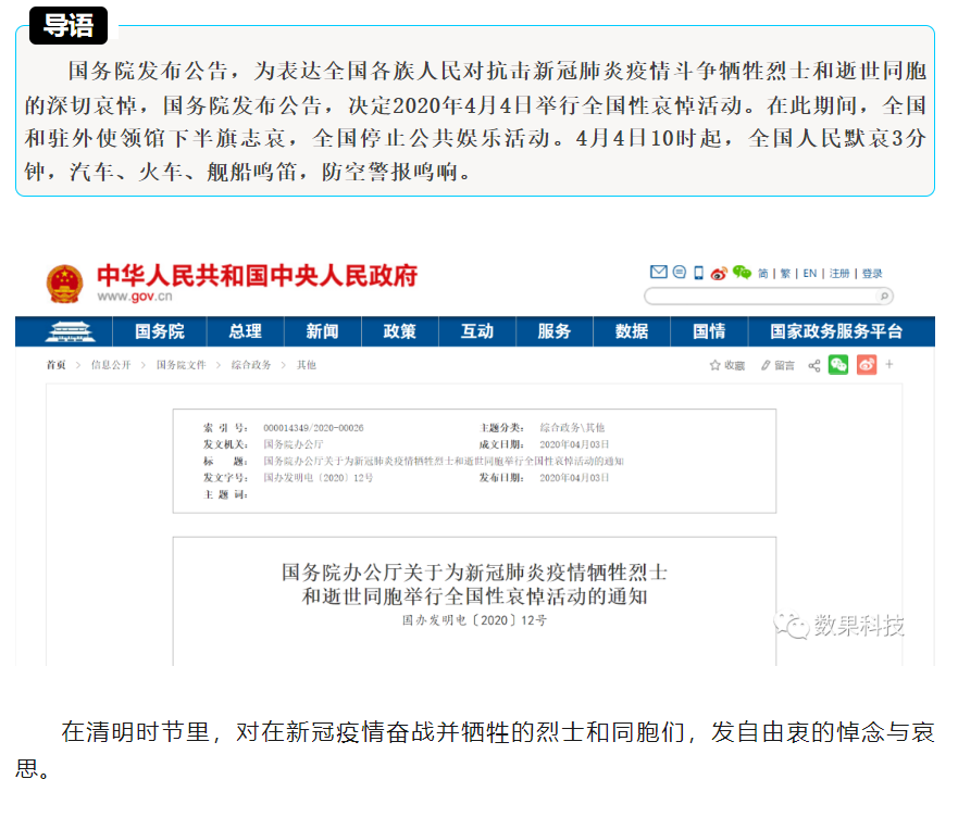 国务院发布公告,为表达全国各族人民对抗击新冠肺炎疫情斗争牺牲烈士和逝世同胞的深切哀悼,国务院发布公告,决定2020年4月4日举行全国性哀悼活动。在此期间,全国和驻外使领馆下半旗志哀,全国停止公共娱乐活动。4月4日10时起,全国人民默哀3分钟,汽车、火车、舰船鸣笛,防空警报鸣响。