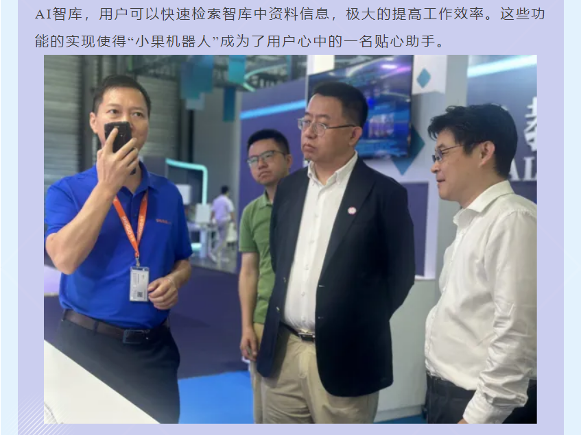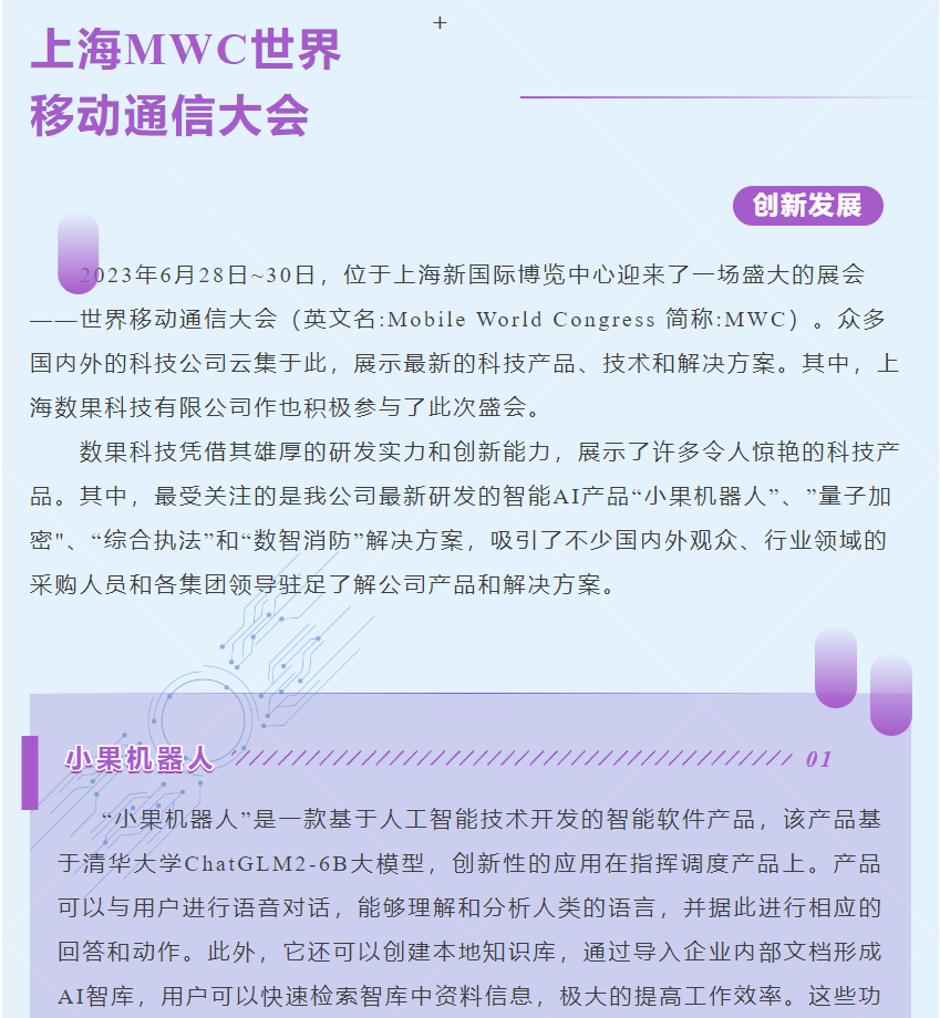 数果科技凭借其雄厚的研发实力和创新能力,展示了许多令人惊艳的科技产品。其中,最受关注的是我公司最新研发的智能AI产品“小果机器人”、”量子加密"、“综合执法”和“数智消防”解决方案,吸引了不少国内外观众、行业领域的采购人员和各集团领导驻足了解公司产品和解决方案。