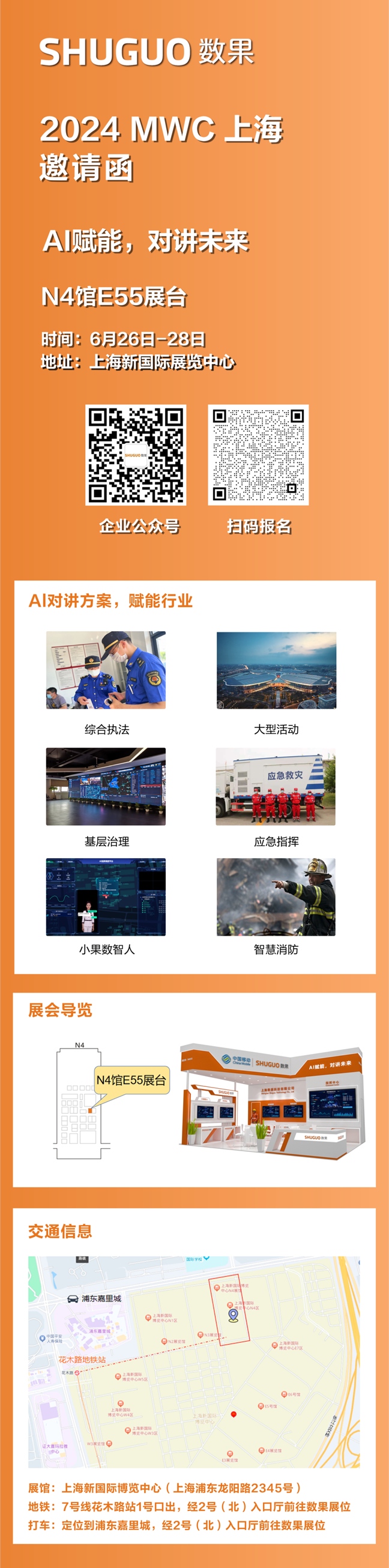 数果科技邀请您参考2024 MWC上海展,以“AI赋能,对讲未来”为主题,创新启发式,强调AI技术为对讲带来的未来变革,聚焦智慧消防、应急指挥、综合执法、基层治理、大型活动等行业应用,亮相小果数智人。