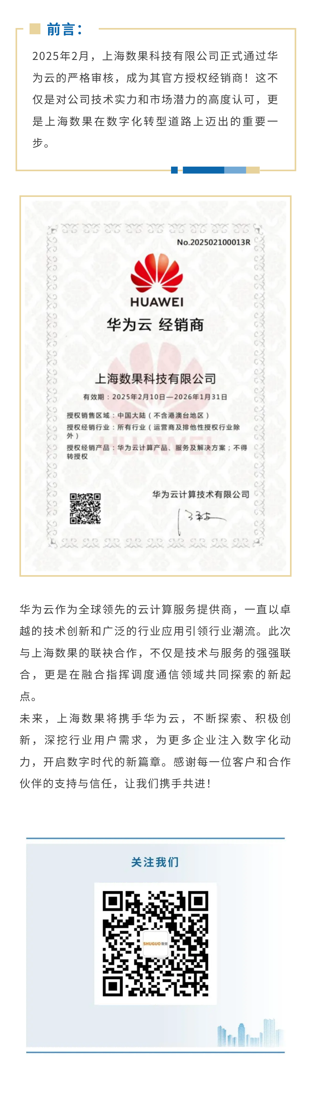 2025年2月,上海数果科技有限公司正式通过华为云的严格审核,成为其官方授权经销商!这不仅是对公司技术实力和市场潜力的高度认可,更是上海数果在数字化转型道路上迈出的重要一步。