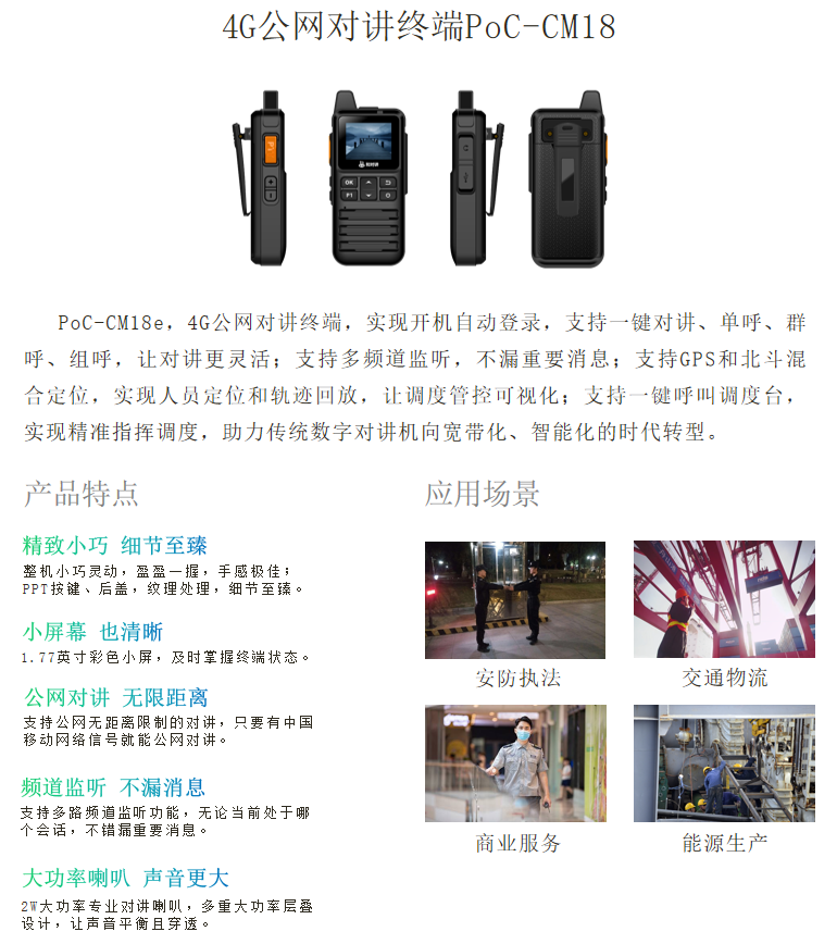 PoC-CM18e, 4G公网对讲终端,实现开机自动登录,支持一键对讲、单呼、群呼、组呼,让对讲更灵活;支持多频道监听,不漏重要消息;支持GPS和北斗混合定位,实现人员定位和轨迹回放,让调度管控可视化;支持一键呼叫调度台,实现精准指挥调度,助力传统数字对讲机向宽带化、智能化的时代转型。