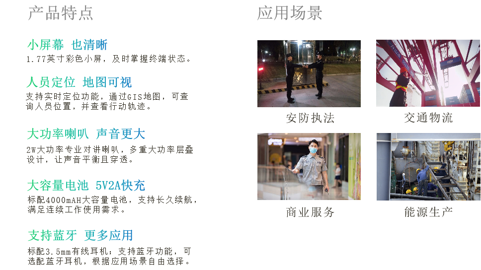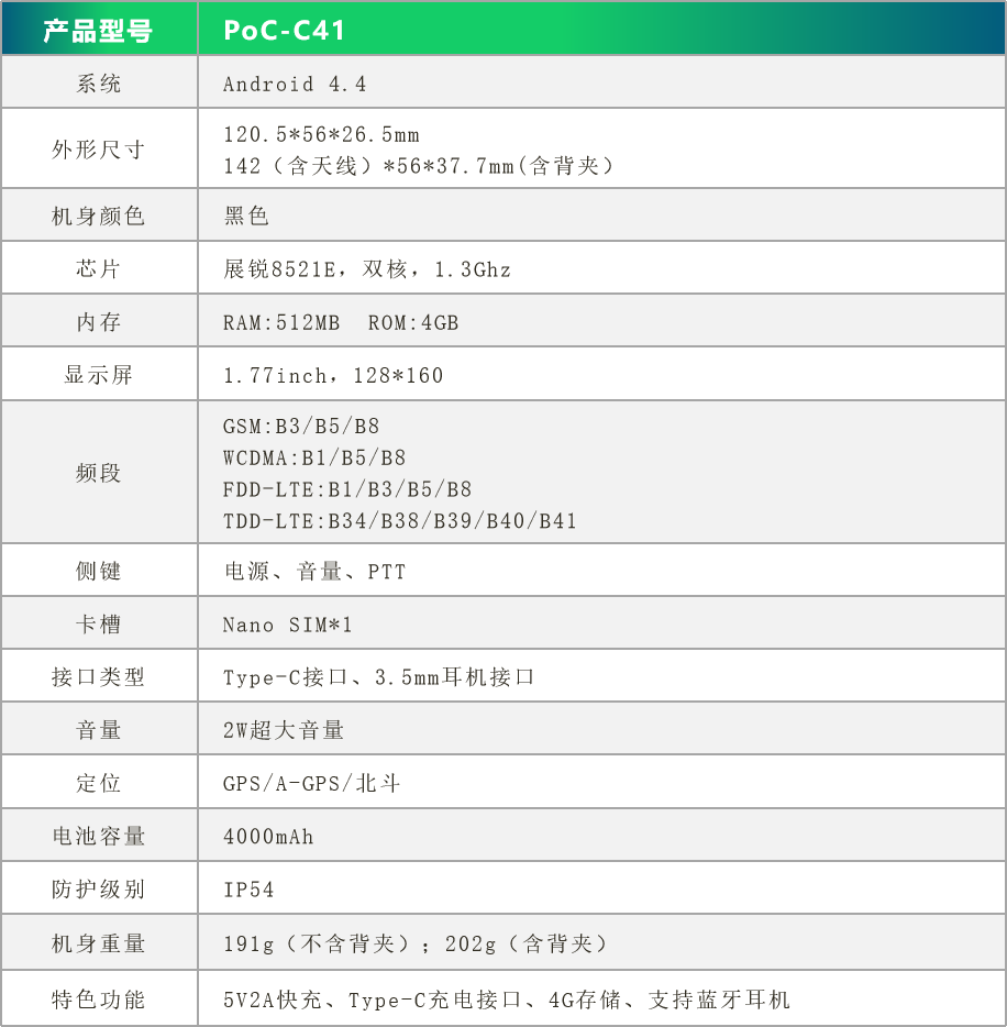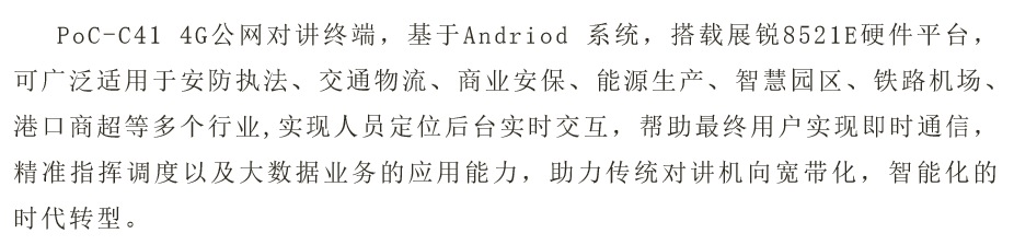 PoC-C41 4G公网对讲终端,基于Andriod 系统,搭载展锐8521E硬件平台,可广泛适用于安防执法、交通物流、商业安保、能源生产、智慧园区、铁路机场、港口商超等多个行业,实现人员定位后台实时交互,帮助最终用户实现即时通信,精准指挥调度以及大数据业务的应用能力,助力传统对讲机向宽带化,智能化的时代转型。