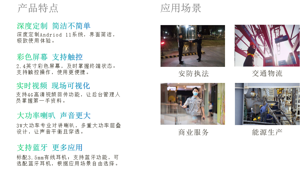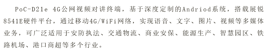 PoC-D21e 4G公网视频对讲终端,基于深度定制的Andriod系统,搭载展锐8541E硬件平台,通过移动4G/WiFi网络,实现语音、文字、图片、视频等多媒体业务,可广泛适用于安防执法、交通物流、商业安保、能源生产、智慧园区、铁路机场、港口商超等多个行业。