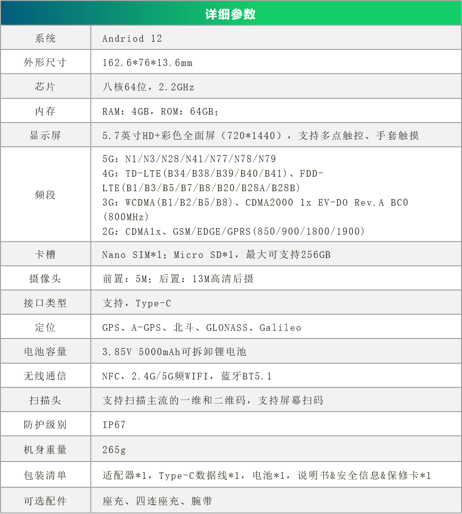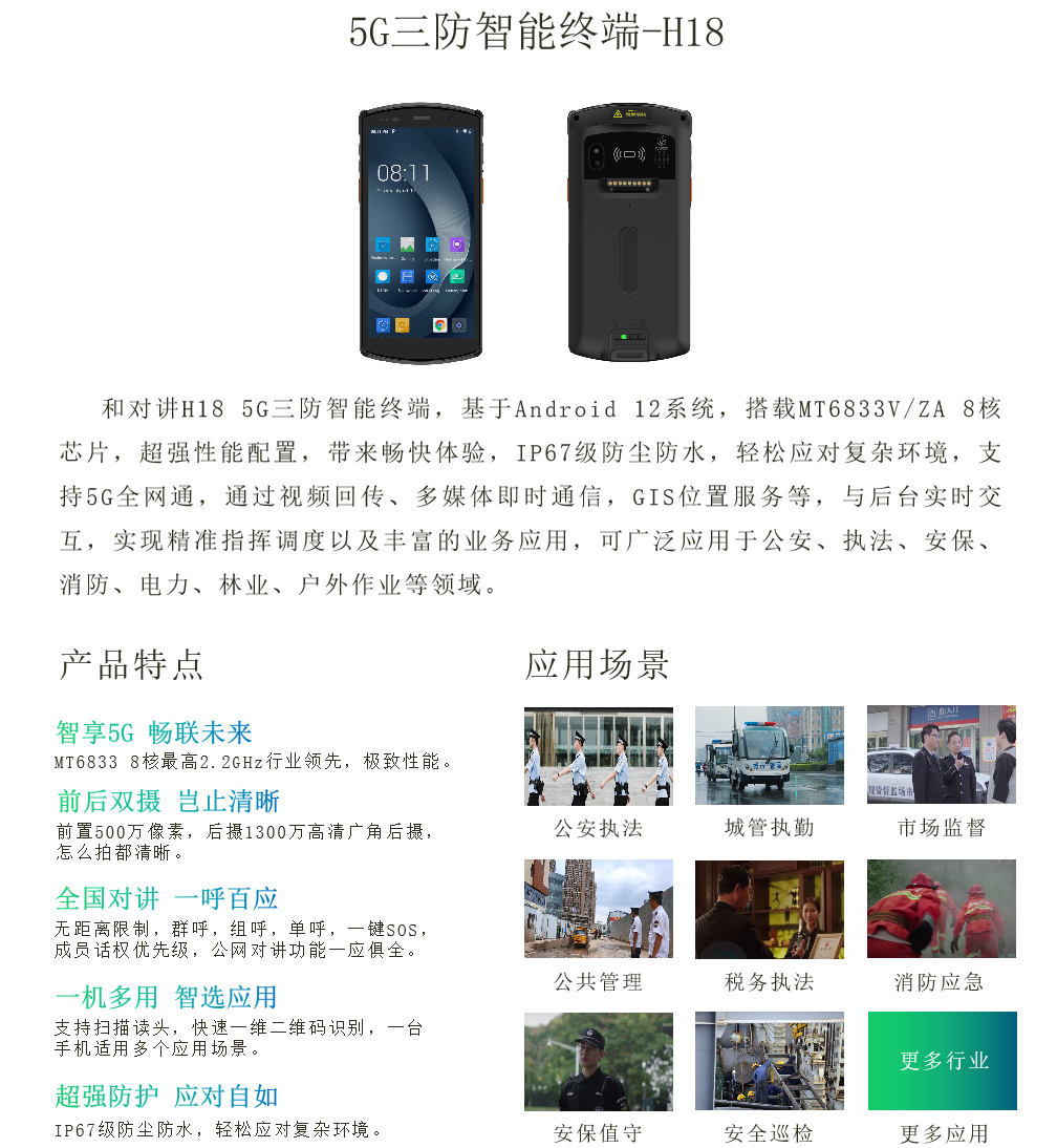 和对讲H18 5G三防智能终端,基于Android 12系统,搭载MT6833V/ZA 8核芯片,超强性能配置,带来畅快体验,IP67级防尘防水,轻松应对复杂环境,支持5G全网通,通过视频回传、多媒体即时通信,GIS位置服务等,与后台实时交互,实现精准指挥调度以及丰富的业务应用,可广泛应用于公安、执法、安保、消防、电力、林业、户外作业等领域。