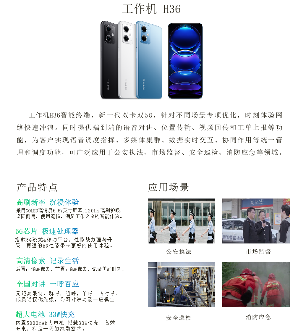 工作机H36智能终端,新一代双卡双5G,针对不同场景专项优化,时刻体验网络快速冲浪。同时提供端到端的语音对讲、位置传输、视频回传和工单上报等功能,为客户实现语音调度指挥、多媒体集群、数据实时交互、协同作用等统一管理和调度功能,可广泛应用于公安执法、市场监督、安全巡检、消防应急等领域。
